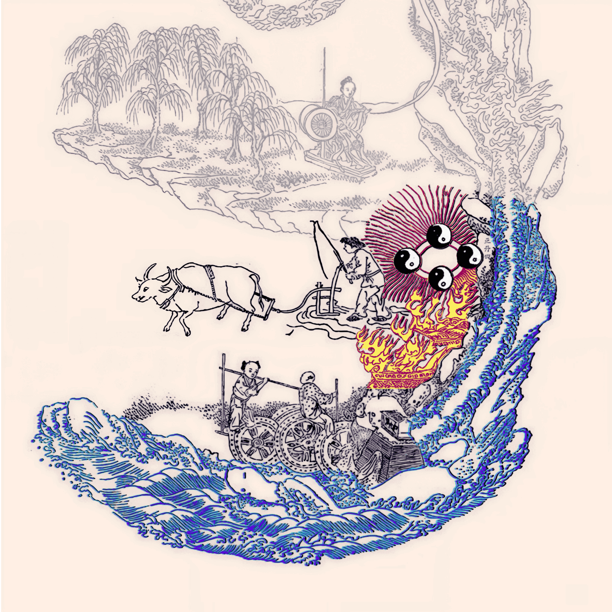 丹 (dān) : signifie “cinabre” ou “vermillon”, un sulfure de mercure rouge (HgS) utilisé en alchimie (Waidan, ou alchimie externe) pour fabriquer des “élixirs d’immortalité”. Sur le plan métaphorique, il représente l'essence raffinée (jing) transformée en énergie vitale (Qi), ce qui correspond au processus de raffinement pratiqué dans le Neidan, ou alchimie interne.