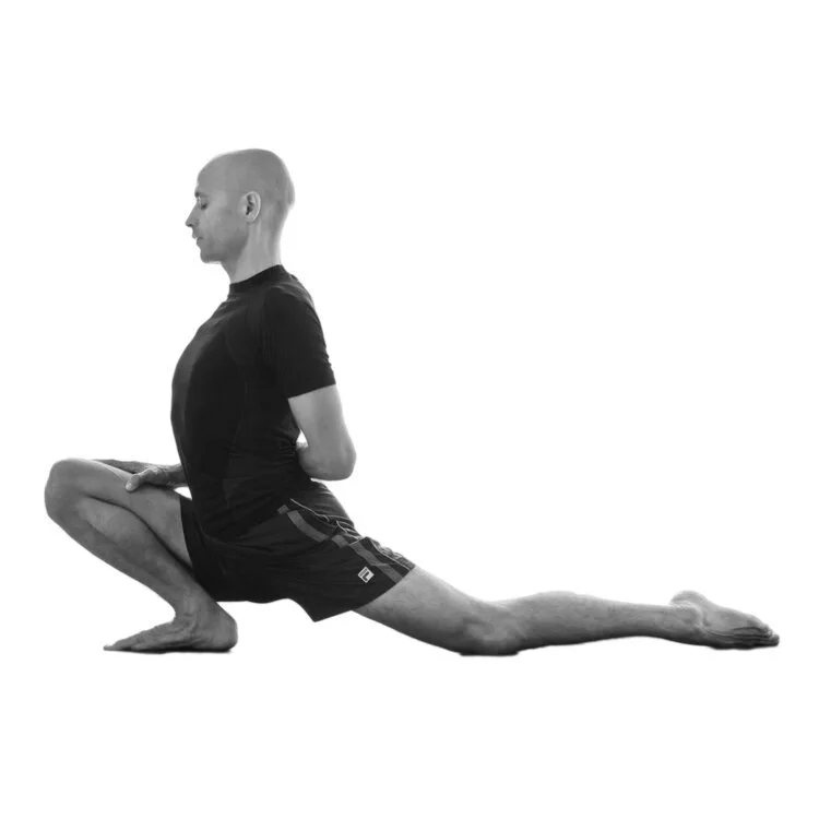 Une position qui permet une exploration plus profonde de l'articulation de la hanche. Détendez tout le corps sur les avant-bras et la jambe arrière si vous le pouvez, placez la tête sur le sol ou sur un support. Une rotation est également possible dans cette variation.